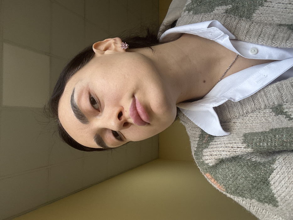 A close-up, slightly low-angle portrait features a young woman with dark hair and prominent eyebrows, looking directly into the camera. She has a neutral expression, with full lips tinted light pink. Her visible right ear displays a pink, flower-shaped stud earring. She is dressed in a white collared shirt, open at the neck, layered under a light-colored (beige/grey) knit cardigan featuring a green and abstract or geometric pattern. A thin silver-colored chain necklace is visible around her neck. The background consists of a plain, light-yellow wall on the left and a lighter, possibly white or off-white paneled ceiling section above and to the right. The scene is indoors. The specific location in the city of Tbilisi, Georgia, cannot be determined from the visual information provided.