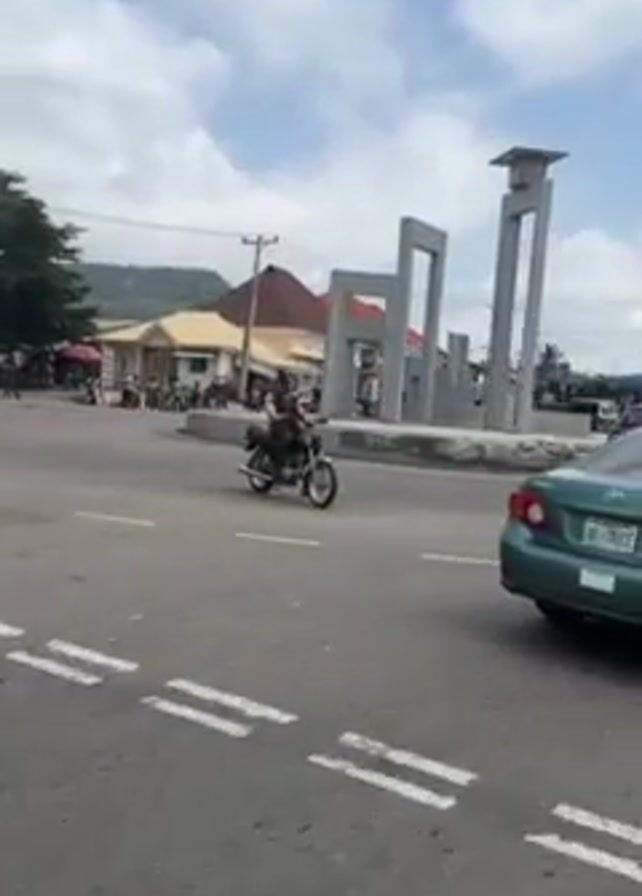 street scene at a traffic circle in what appears to be a Nigerian town. A green car is driving on the right, and a motorcycle passes in front of the car. In the middle of the traffic circle, there's a modern sculpture made of gray concrete. Across the street, there are buildings, people walking around, and vendors with stalls. The sky is partly cloudy.