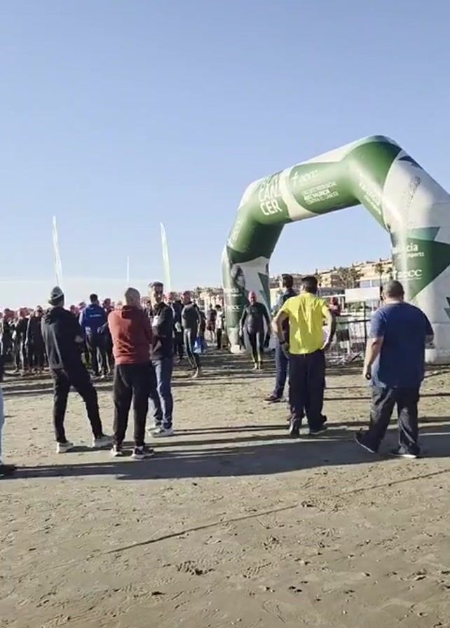 group of people gathered on a beach. The crowd includes people in wetsuits, some wearing swimming caps, seemingly preparing for a swimming event. There's a large inflatable arch marking the start or finish line of the event. The beach itself appears sandy, and the sky is clear and blue. Some people are standing around talking or stretching, while others are walking towards the water. The atmosphere seems relaxed and anticipatory. In the background, some buildings and possibly a port area can be seen.