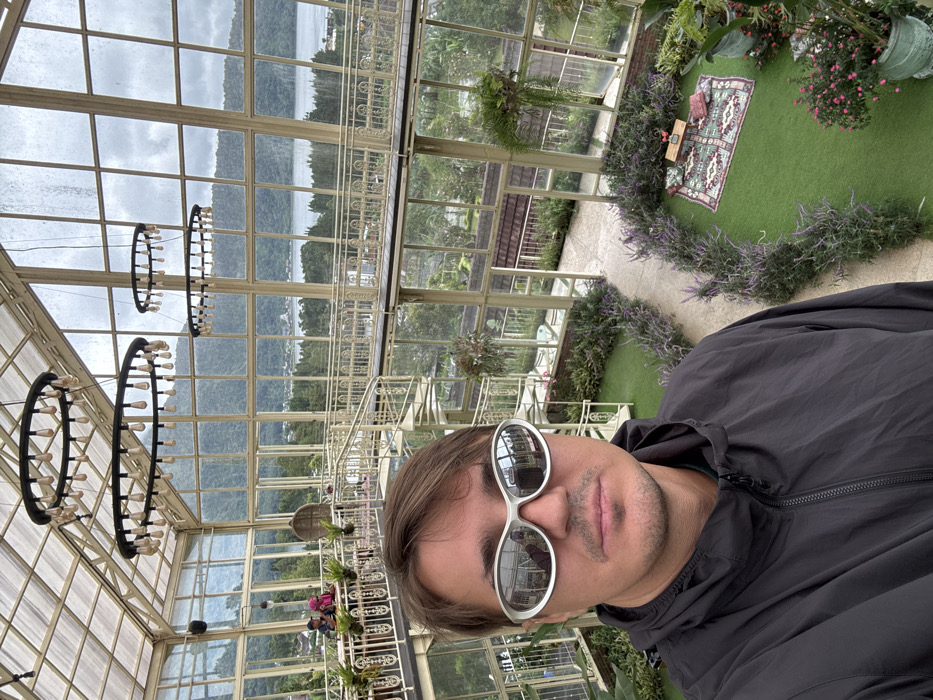 A man wearing silver, oversized sunglasses and a black jacket stands inside a large greenhouse-like structure. Tall, symmetrical windows reveal a lake and forested hills in the background. Ornamental lights hang from the ceiling. A garden is visible, with greenery, flowers, and a small rug laid on artificial grass. The image has been rotated counter-clockwise.