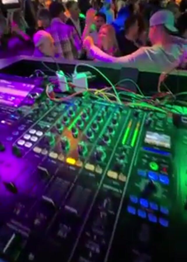 lively scene inside a nightclub or bar. From the DJ's perspective, a Pioneer DJ mixer and turntables are in the foreground, with numerous colorful buttons and lights illuminated. A crowd of people is visible in the background, dancing and socializing under multiple disco balls hanging from the ceiling. The venue appears crowded and energetic, with flashing lights and the general atmosphere of a party. Red and green accents are visible in the background, possibly from signage or decor. The camera gradually moves from a close-up of the DJ equipment to a wider view of the entire venue.