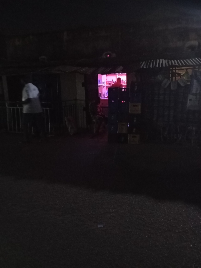 The image depicts a nighttime scene in Jos, Nigeria. A small commercial establishment with a corrugated metal roof is centrally featured, characterized by a brightly illuminated interior displaying numerous bottles on shelves under a reddish-pink light. A person is visible behind the counter within this lit area. Directly in front of the establishment, several dark beverage crates are stacked. To the left of the crates, a figure is dimly seated. Further to the left, a male individual stands near a metal railing, wearing a light-colored short-sleeved shirt and dark trousers. The ground is a dark, paved surface, with a small light-colored rectangular object present in the foreground. The surrounding environment is predominantly dark, with minimal external light sources.