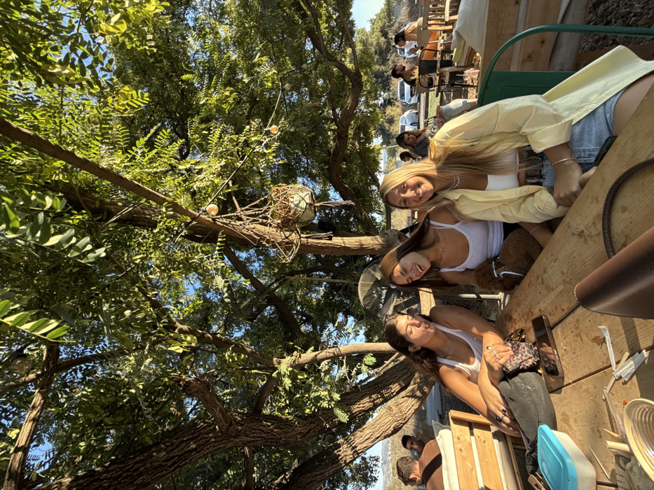 The image depicts an outdoor dining area under a canopy of mature trees in Lapid, Israel. In the foreground, three young adult women are seated at a rustic wooden picnic table, posing towards the camera. The woman on the left, with dark hair and a white tank top, smiles with pursed lips. A black mobile phone and a dark patterned bag rest beside her on the table. The central woman, also with dark hair and a white tank top, is captured mid-laugh, looking towards her right. A small brown, fuzzy object is next to her. The woman on the right, with blonde hair, a white crop top, and a light yellow unbuttoned shirt over denim shorts, smiles broadly at the camera. The table holds various items including a blue and clear plastic container, empty white paper bowls, and discarded wrappers. String lights with spherical bulbs are strung between the overhead tree branches, which are densely covered with green foliage. A macrame hanging planter is suspended from a branch. A large industrial fan is positioned behind the women in the middle ground. In the background, partially blurred, are other patrons seated at additional wooden tables under the trees, and several white cars are parked further beyond on a light-colored dirt surface. The terrain behind the seating area appears dry and hilly, under a clear blue sky. The lighting suggests a sunny late afternoon or early evening.