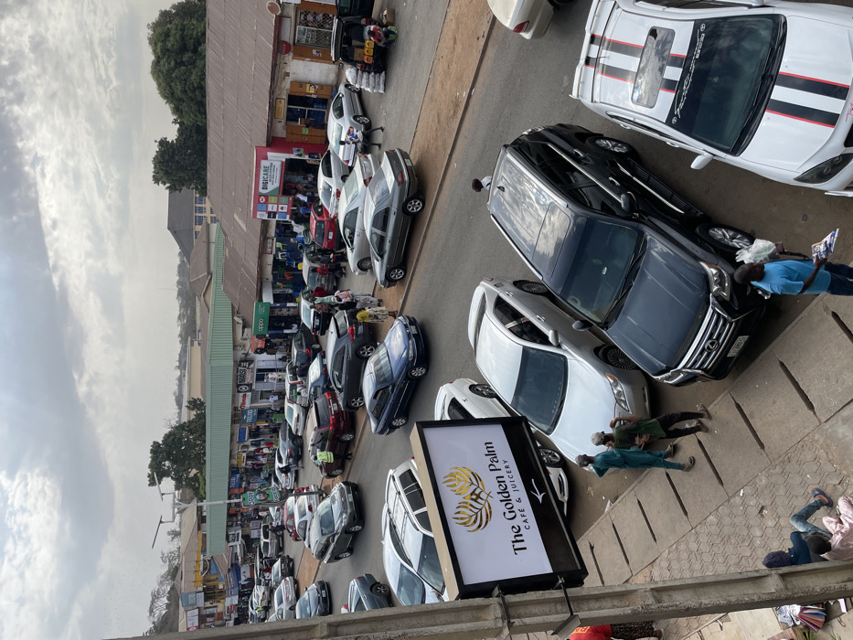 The image depicts a bustling commercial street scene in Jos, Nigeria, observed from an elevated vantage point under an overcast sky. The roadway is densely populated with parked and moving vehicles, including numerous sedans, SUVs, and vans, indicating significant activity. In the left mid-ground, a prominent, illuminated rectangular sign for "The Golden Palm Cafe & Juicery," featuring a golden palm tree logo, is affixed to a utility pole. Below this sign, on a concrete sidewalk with visible drainage grates, two men stand upright, one in a light blue tunic and the other in a green shirt and cap. Further left along the sidewalk, two individuals are seated. In the right foreground, a black Lexus GX SUV is parked, adjacent to a white car distinguished by red and black racing stripes across its hood and roof. A man in a blue shirt, holding what appear to be papers or flyers, stands near the front of the Lexus. Adjacent to a parked van in the right foreground, several large sacks, possibly containing goods, are stacked on the ground, with a person seated nearby. The street is flanked by commercial buildings, mostly single-story structures with various storefronts. On the left side of the street in the background, "TREND" and "OPPO" branding is visible on storefronts with green roofs. On the right side, a building with a corrugated metal roof houses "UNICARE Pharmacy and Supermarket" (indicated by a red sign) and "DIGICARE Mobile Phone & Gadget Sales, Repair & Accessories" (indicated by a red and white sign). Multiple individuals are gathered around these storefronts. Approximately 20-30 people are visible throughout the scene, engaged in various activities such as walking on sidewalks, navigating between parked cars, standing, and congregating near shops. Solar-powered streetlights are discernible in the background, along with other distant buildings and some scattered trees. The overall environment portrays an active urban commercial zone.