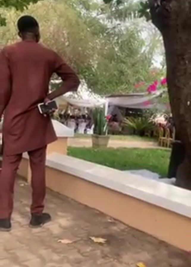 n outdoor event, possibly a wedding or a party. Men in traditional African attire stand near a white tent where other people are seated at tables. Some children are also present, sitting on plastic chairs. The ground is paved with patterned bricks and scattered with leaves. There are trees and potted plants around, adding to the outdoor ambiance. The camera moves slightly, providing different views of the scene.