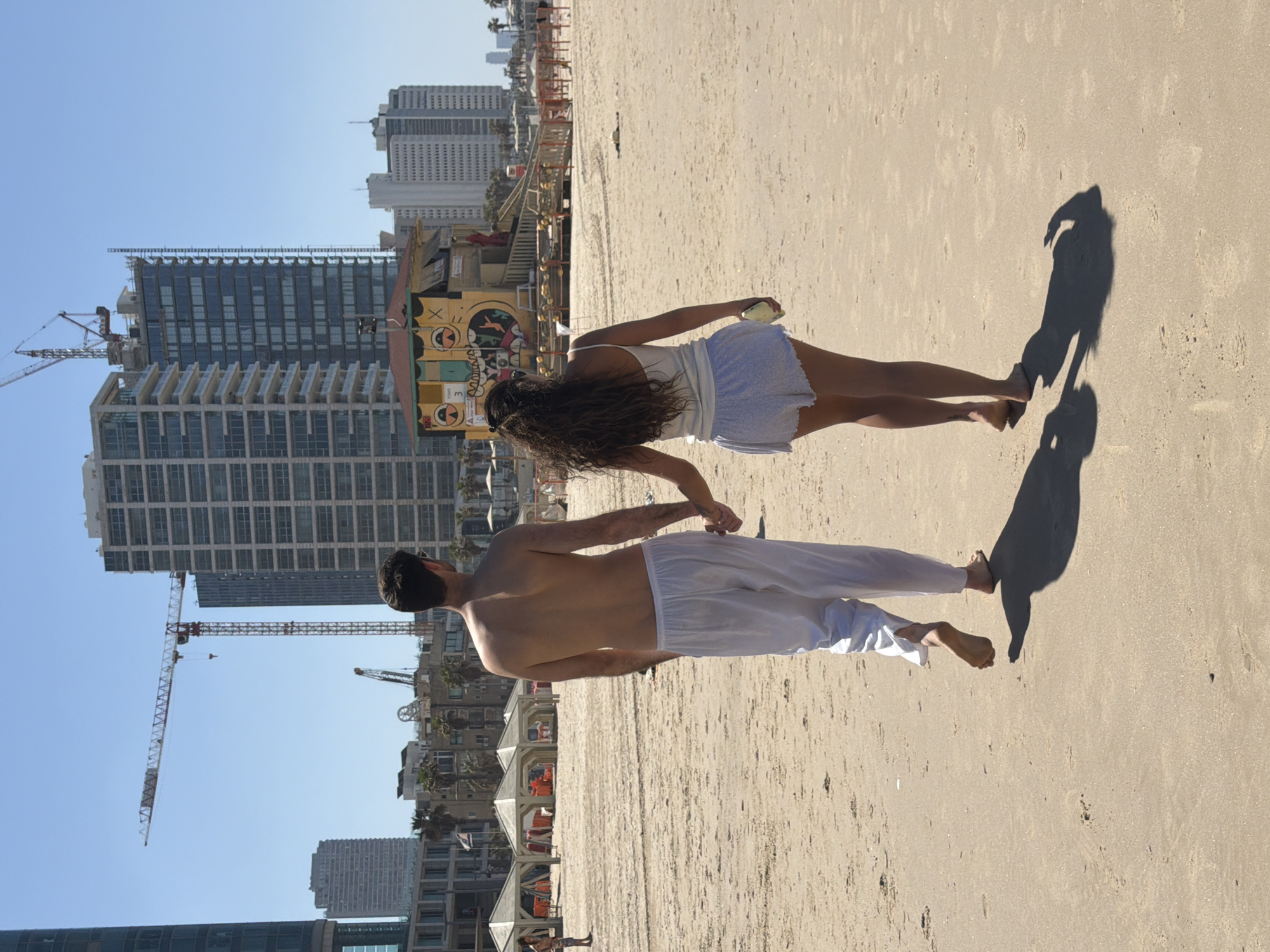 The image depicts a bright, clear day on a sandy beach in Tel Aviv, Israel. A man and a woman walk barefoot away from the camera, holding hands. The man, bare-chested, wears loose white pants. The woman, with long dark curly hair, wears a white spaghetti-strap tank top and light-colored shorts, holding a mobile phone in her right hand. Their elongated shadows are cast on the sand to their left. In the midground, a yellow and red lifeguard station, adorned with large, cartoonish facial graffiti, stands prominently. It is labeled with the number "3". Wooden barriers extend from the station towards the beach. To the left of the lifeguard station, several light-colored, hexagonal canvas shelters with red interiors are visible. A solitary male figure in swim trunks stands near one of these shelters further left. The background reveals the urban skyline of Tel Aviv, dominated by multiple modern high-rise buildings constructed of glass and concrete. Several large red and white construction cranes are visible above these buildings, indicating ongoing development projects. The sky above is clear blue.