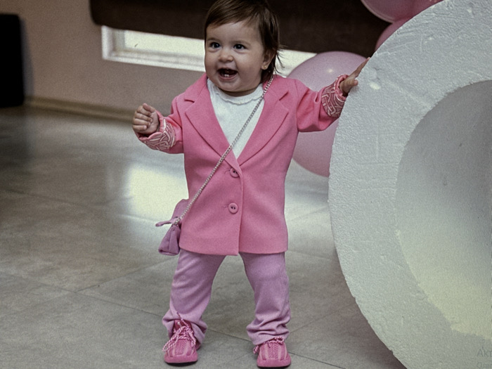 An image captured in Stara Zagora, Bulgaria, depicts a young child standing indoors. The child, a toddler with dark hair, is positioned centrally, facing the viewer with an open-mouthed smile. The child wears a bright pink suit, comprising a blazer with two visible pink buttons and embroidered cuffs, pink trousers, and pink athletic-style shoes with laces. A small pink handbag with a silver chain strap is worn cross-body. The child's left hand rests on a large, textured white cylindrical or semi-cylindrical object that stands vertically to the right of the frame. In the background, to the child's right, several pink balloons are visible. The floor is covered with light-colored square tiles. To the left background, a dark rectangular object and a window with a brown blind are partially visible against a light-colored wall.