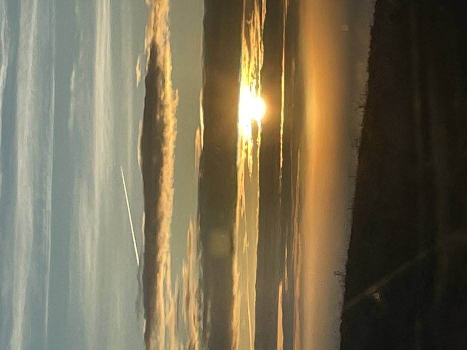 Golden sunlight pierces through cloudy formations in an ethereal, vertical composition. Sky is blue and a wispy contrail cuts diagonally across the left side. To the right, shadows are cast by dark objects out of focus. The atmosphere is filled with a sense of warmth.