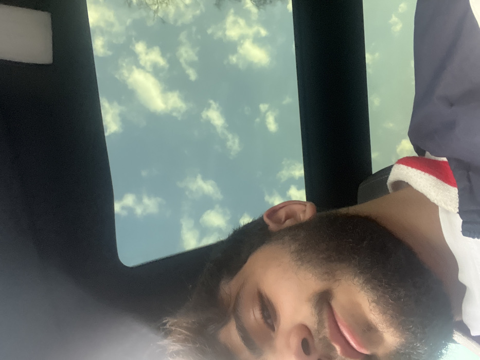 An upward-angled selfie captures a male subject positioned in the lower-left quadrant of the frame, seated within a vehicle
