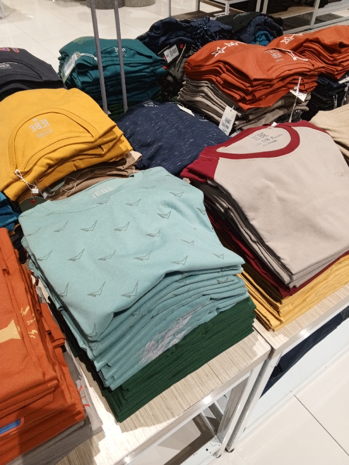 - "A variety of folded T-shirts are neatly stacked on white tables" by FM-eCPjp1, licensed under CC BY 4.0