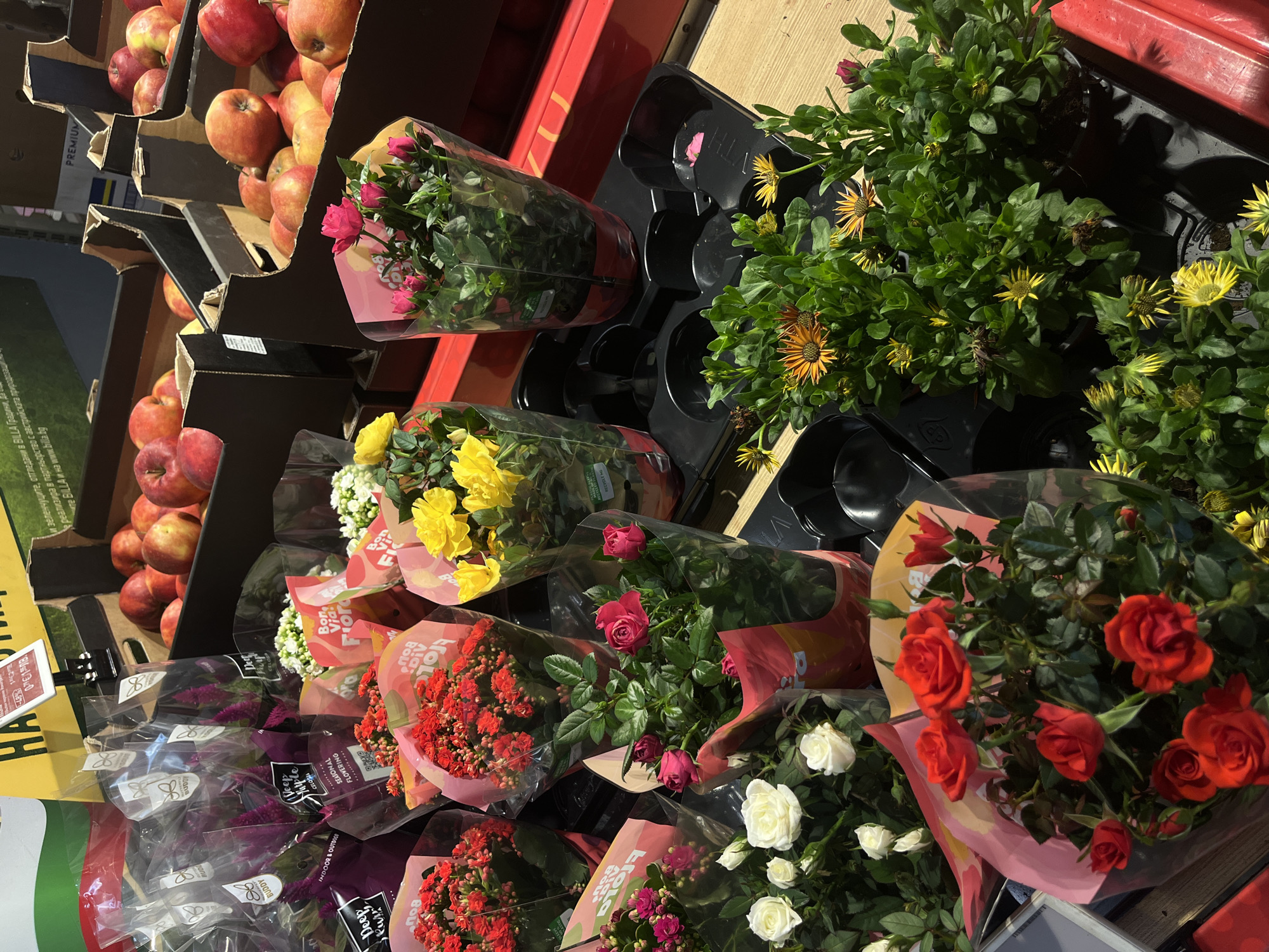 display of various flowers and apples. The flowers include roses of different colors (red, white, pink, yellow), other smaller flowers, and green plants with yellow or orange daisy-like flowers. These are arranged in plastic wraps and containers. Next to them are several boxes of apples. The image contains text in Bulgarian, and mentions "BILLA", indicating that the location might be a BILLA supermarket. Based on the OCR, the image includes “BILLA and на www.bilia.bg”. The OCR also suggests the presence of a yellow sign with the inscription "HA." The text implies the display is in Haskovo, Bulgaria.