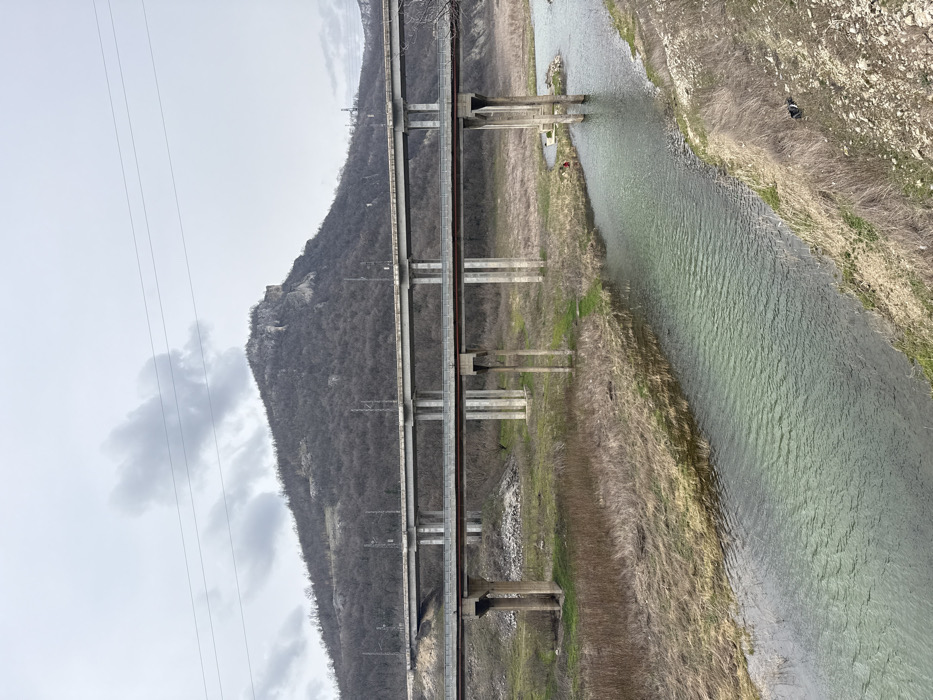The image depicts a rural landscape in Asparuhovo, Bulgaria, under an overcast sky. In the foreground, a greenish-blue river flows, bordered by banks primarily covered in dry, brown, and yellowed grasses and reeds, with interspersed patches of green vegetation. Directly above the river, two concrete viaducts span the scene. The lower viaduct consists of multiple concrete piers supporting a flat deck. Above it, a second, slightly higher viaduct, identified as a railway bridge by its overhead catenary lines and supports, runs parallel, also on concrete piers. In the mid-ground, beneath the rightmost span of the lower bridge, two individuals are visible on the riverbank. One individual, wearing a red top or jacket, is positioned close to the water's edge, seemingly attending to an object or activity at ground level. A second, less distinct individual is nearby. A small, light-colored structure is present on the bank near these individuals. The background is dominated by a large, tree-covered hill or mountain. The trees are bare, suggesting a dormant season, and prominent rocky outcrops are visible near the summit, particularly towards the right. Overhead power lines traverse the upper portion of the sky. The overall lighting is diffused, indicating an overcast day.