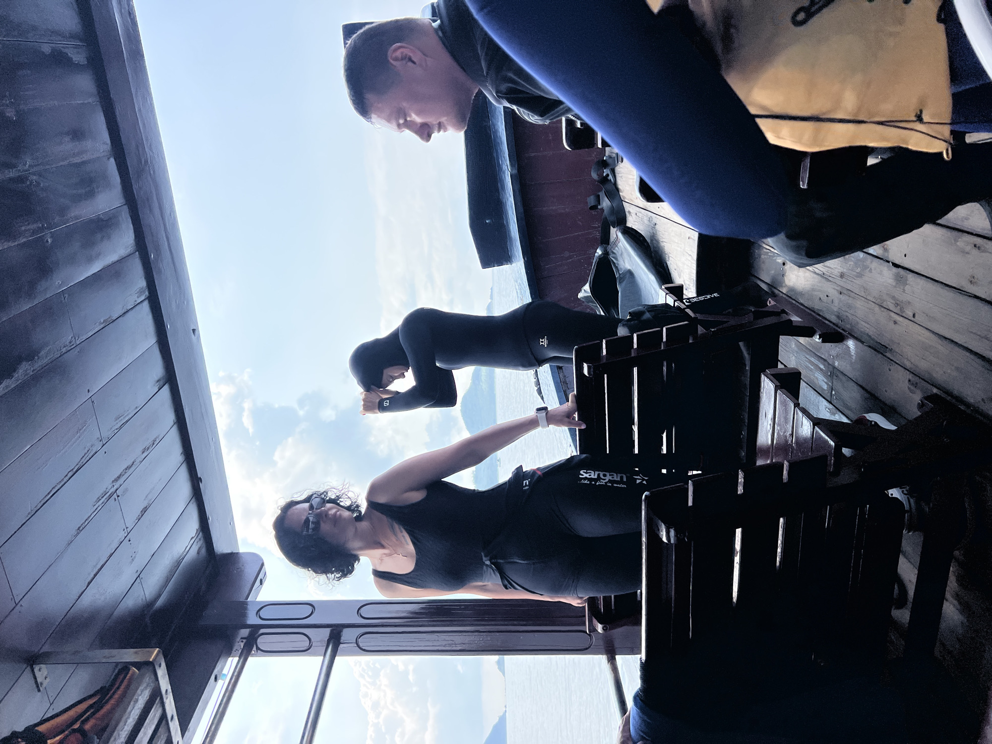 Three people are visible on a wooden vessel. The person closest to the camera is a woman with curly hair wearing sunglasses, a black tank top, and dark bottoms with "sargan" printed on the leg. She is leaning over the side of the boat, looking down with her arm extended and a white watch on her wrist. Behind her, a person in a black wetsuit with a hood is also looking over the side. At the top of the frame, a man is visible looking downward with blue wetsuit sleeves visible. The backdrop suggests a coastal area with water and islands, consistent with the Natural Heritage Area Trang in Vietnam. The sky is partially cloudy.