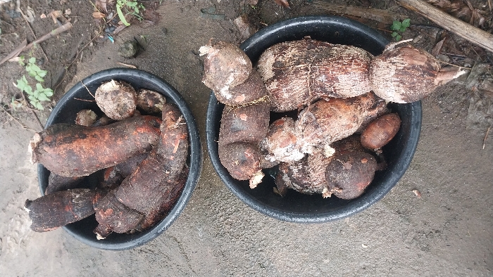 Two black plastic basins are situated on a damp, gray concrete surface in Lambhuk, Indonesia. The upper basin contains approximately seven large, elongated root vegetables, likely yams or cassava, characterized by dark brown and reddish-brown coloration with adhering soil. Their ends display rough breaks or cuts. The lower basin holds a collection of approximately ten irregularly shaped, medium to dark brown root vegetables, consistent with taro or cocoyams, similarly covered in soil and exhibiting fibrous textures. One smaller, ovate, reddish-brown tuber is also present within the lower basin. To the right and top portions of the frame, damp dark earth is visible, sparsely vegetated with small green plants and scattered dry organic debris, indicating an outdoor setting.