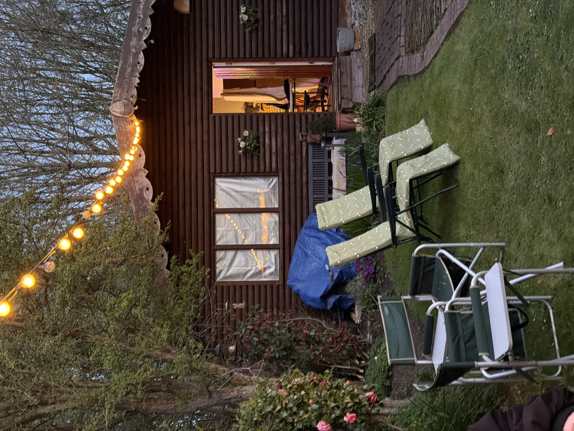 The image captures an outdoor scene, seemingly in a garden, at dusk or early evening. A log cabin-style building is centrally positioned with a string of lights illuminating its roofline. The cabin has an open door revealing furniture inside. A window below the door is partially covered. A blue tarp is draped over something in the garden adjacent to the cabin, near some folded lawn chairs. The surrounding environment includes trees, plants, and lawn. No people are visible in the image, though a part of one person is visible on the lower right. The image does not contain any details suggesting the City of London in the United Kingdom.