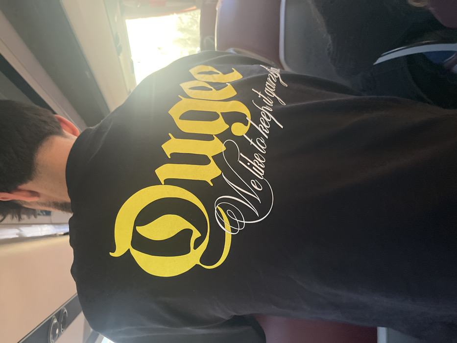 The image depicts the back of an adult male seated within what appears to be a public transport vehicle, such as a bus or train, in Leiria, Portugal. The male has short, dark hair with a fade haircut and visible stubble or a short beard on his neck. He is wearing a black long-sleeved t-shirt with text printed on the back. The prominent text, in a large yellow gothic-style font, reads "Ougee." Below this, a secondary line of text in white cursive font is partially visible, reading "We like to keep it gar..." The interior environment includes light-colored overhead panels or ceiling, and dark red or maroon seatbacks are visible on either side of the subject. Bright sunlight enters through windows on the right side of the frame, creating a lens flare on the t-shirt. A portion of another passenger's dark clothing is visible in the lower right corner. The individual is oriented away from the camera, and no specific actions or interactions are discernible.