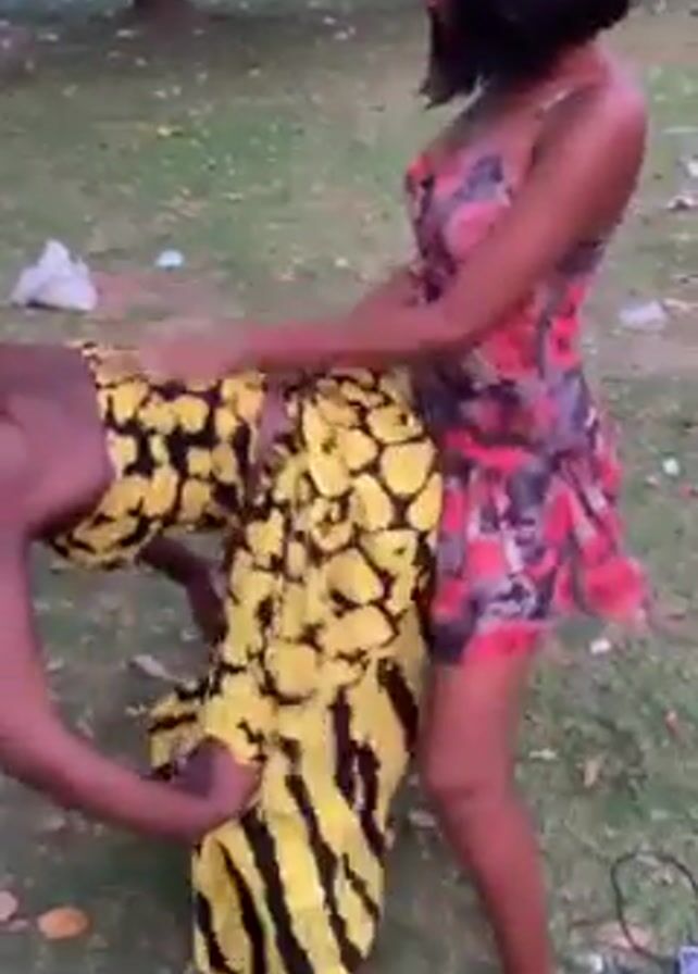 A short video shows two dark-skinned women in an outdoor setting, possibly a park. One woman is wearing a short, floral-patterned dress with thin straps. She is standing behind and to the side of the other woman, who is wearing a long, yellow dress with black stripes. The woman in the yellow dress is bent over, and the other woman appears to be holding onto her, possibly adjusting or holding the dress. There are other people in the background, and some litter is visible on the grass. The overall impression is of a casual, informal gathering or celebration.