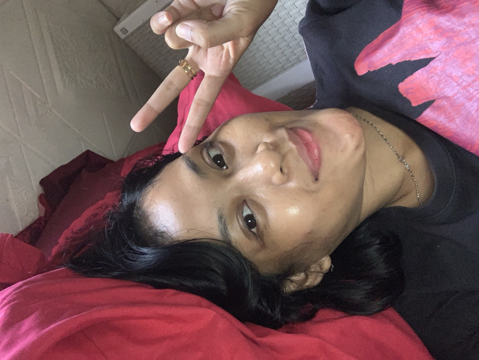 A woman with dark hair and a ring on her finger reclines on a red pillow or blanket. She is wearing a dark t-shirt with a red pattern and a delicate necklace. She holds up her hand in a peace sign. The background features a textured white wall.