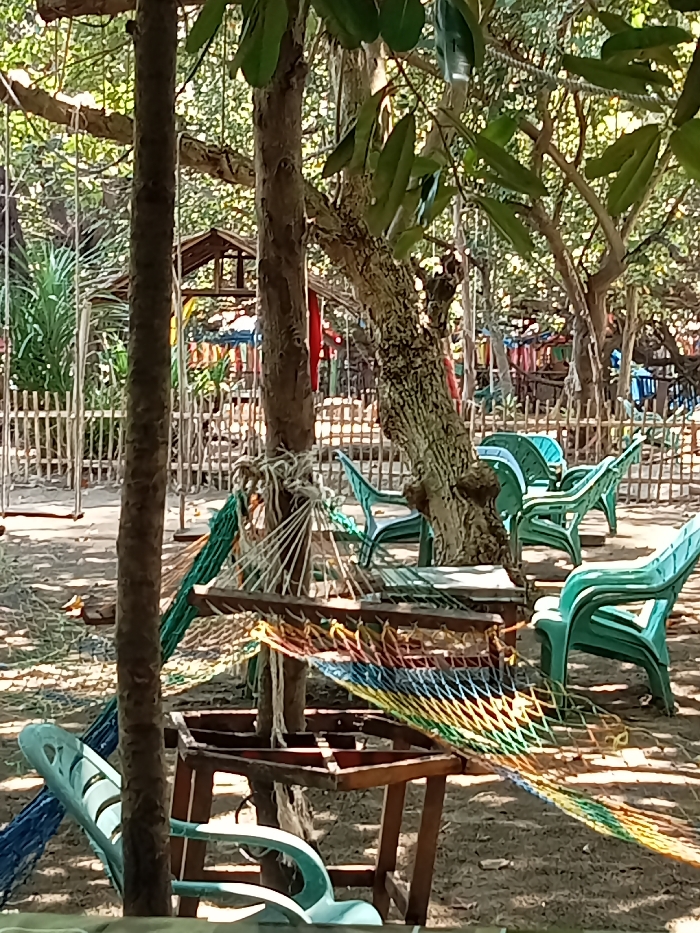 This image depicts an unoccupied outdoor leisure area in Reudeuep, Indonesia, under bright daylight. The scene is characterized by numerous trees with visible trunks and green foliage. In the immediate foreground, two prominent tree trunks frame the view. A multi-colored net hammock, featuring red, orange, yellow, green, and blue sections, is suspended between the central tree and an unseen anchor point to the right. A low wooden stand or table structure is positioned at the base of the central tree. Several light green plastic chairs are scattered across the sandy ground, including one in the lower left and a cluster of four further back on the right. A blue mesh net is partially visible on the ground to the left. To the far left, two wooden swings hang from tree branches. A low wooden fence, constructed from vertical poles, spans the midground, separating the foreground from the background. Beyond the fence, additional trees, small wooden hut-like structures with pitched roofs, and colorful accents, including red and blue elements, are visible, along with more scattered plastic chairs. No individuals are present in the scene.