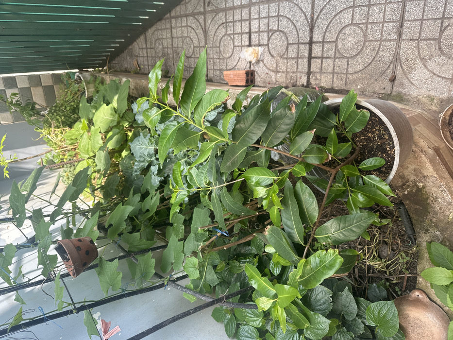 close-up view of a potted plant with large, green leaves. The plant is situated on a brick walkway, next to a brick wall and a green metal fence. The walkway is made of patterned concrete tiles, and the brick wall appears to be part of a building. The plant is situated in a well-lit area. The coordinates provided, 10.355 latitude, 107.091 longitude, place the location of the image in Vũng Tàu, Vietnam. There are no people present in the image. The plant is growing towards the right side of the image. The plant is potted in a brown container. The container is slightly obscured from view by the leaves. There is a small, round pot on the metal fence in the background. The pot has a brown ceramic exterior and is decorated with black spots. There is a small piece of red brick and some trash on the ground near the pot. There is a small, brown object at the bottom of the image. The object is partially obscured from view by the leaves.