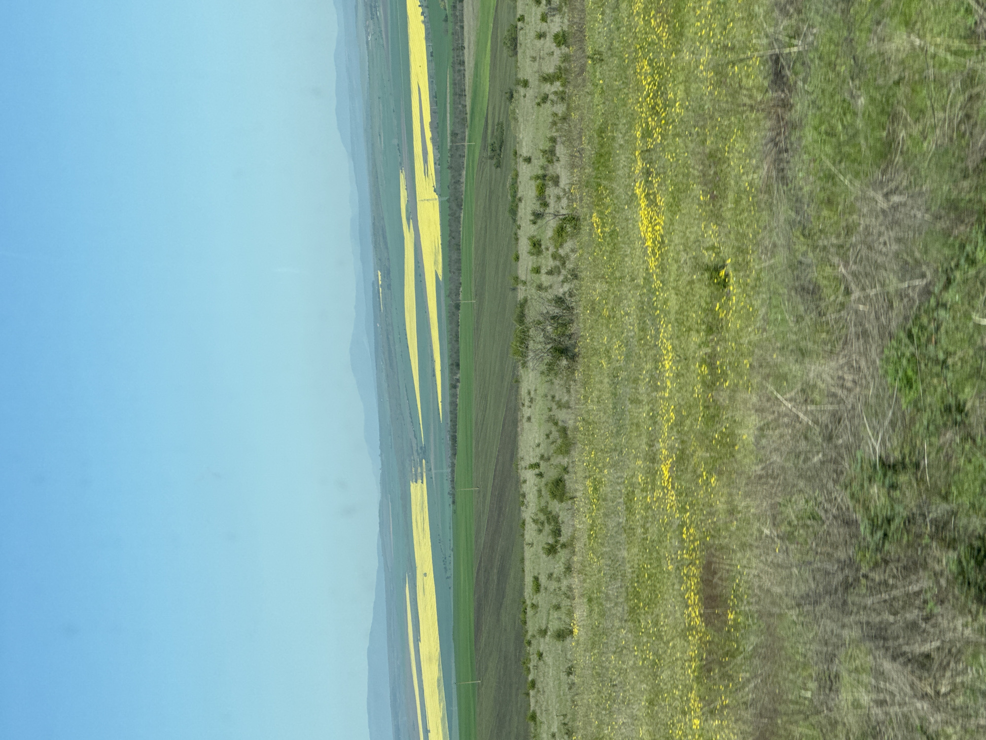 landscape near Karnobat, Bulgaria. The sky is clear and blue. In the distance, there are faint hills or mountains. The landscape consists of fields, some with yellow crops, possibly rapeseed, others with green crops, and areas of grassy vegetation with small yellow flowers. Power lines run through the fields. The foreground is dominated by dense green vegetation.