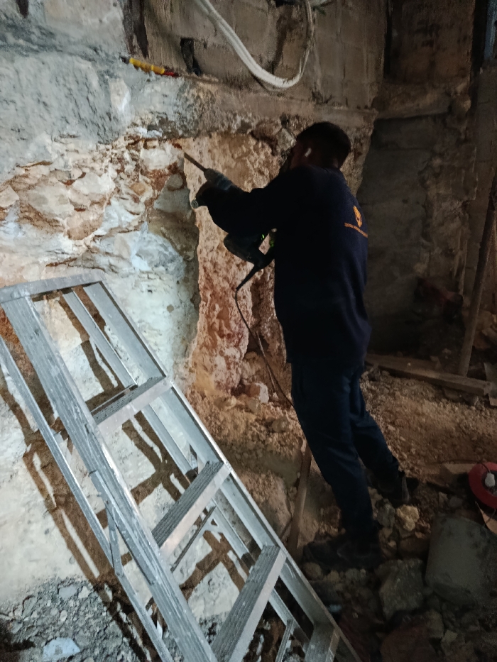 A construction worker in dark attire uses a power drill to break through a weathered stone wall