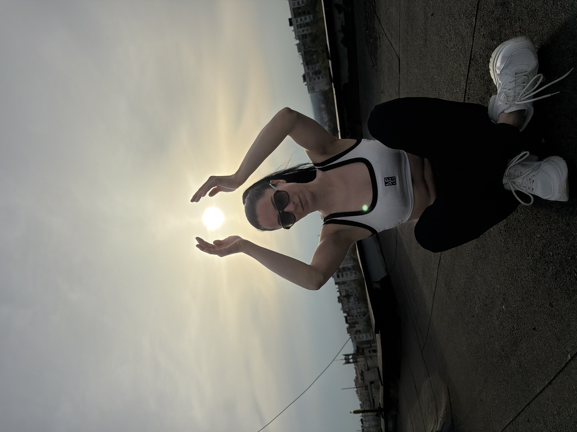 A woman is crouching on a rooftop at sunset, wearing a white tank top, black leggings, and white sneakers. She is holding her hands up to frame the sun. She is also wearing sunglasses. The city of Pleven, Bulgaria, is visible in the background. The rooftop is a dark, asphalt-like material. There is a building in the background.