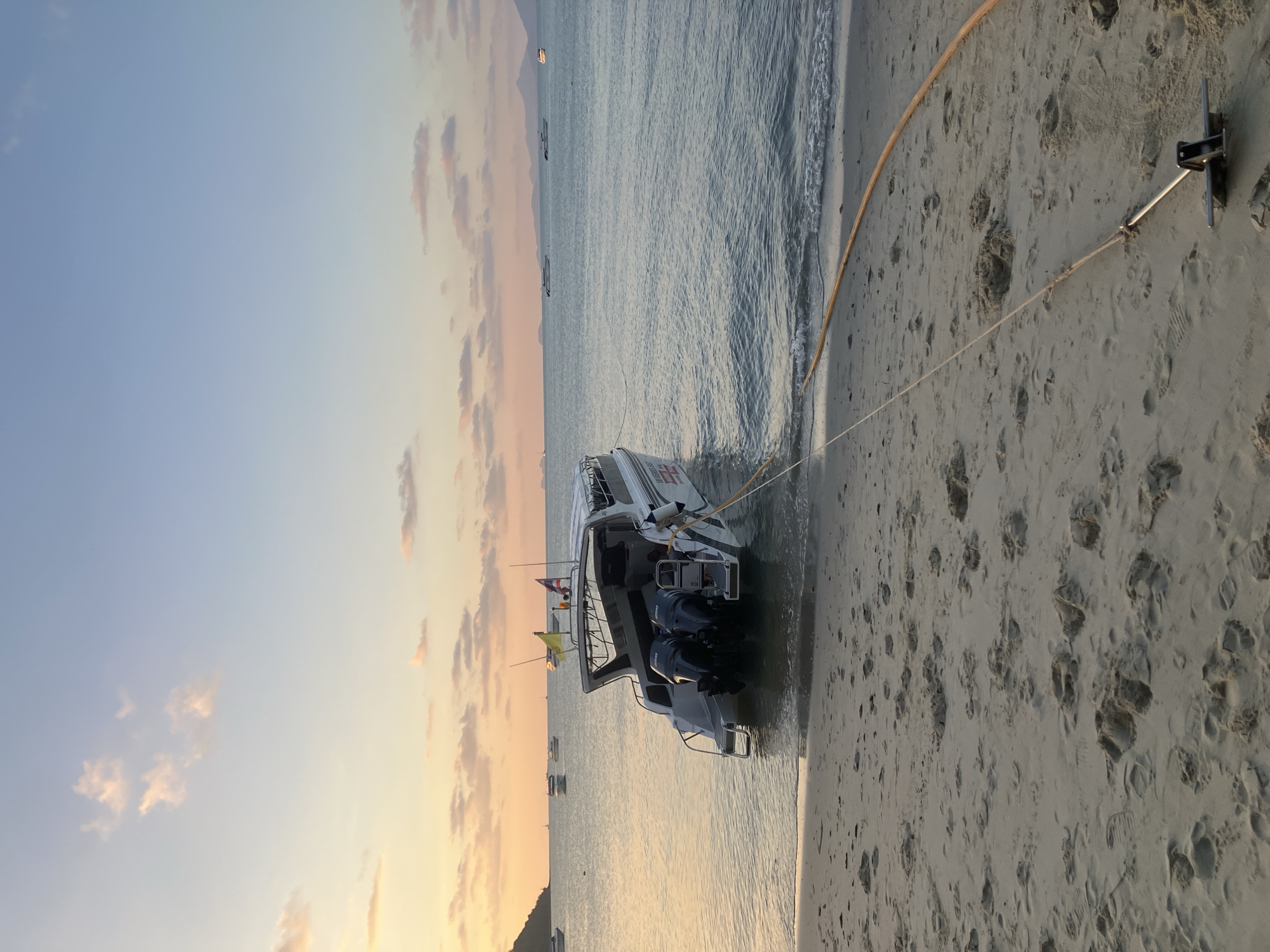 The scene depicts a coastal environment at sunset or dusk in Baan Bang Rak, Thailand. In the foreground, a sandy beach occupies the lower third of the image, showing numerous footprints and disturbed sand. A light-colored rope extends from the upper right toward the lower right, secured into the sand by a metal ground anchor with a T-bar component. A long, curved, light brown tubular object rests on the wet sand near the waterline, parallel to the shore. In the midground, a white and grey multi-engine speedboat is partially beached, with its stern facing the viewer. The stern features three dark-colored outboard engines. Two flags, one yellow and one displaying the flag of Thailand, are affixed to the boat's stern structure. Red lettering, partially legible as "AND SERVICES EAST," is visible on the port side of the hull. The rope from the ground anchor on the beach extends to the bow of this speedboat, indicating it is secured. The water is calm with small waves breaking at the shoreline, reflecting the sky's hues. The background shows an expanse of ocean under a sky transitioning from light blue overhead to orange and pink near the horizon, characteristic of sunset. Scattered light clouds are present. Multiple other boats, including larger yachts, are visible anchored or moving in the distance across the water. A vegetated landmass with hills is visible on the left horizon. No individuals are present in the image.