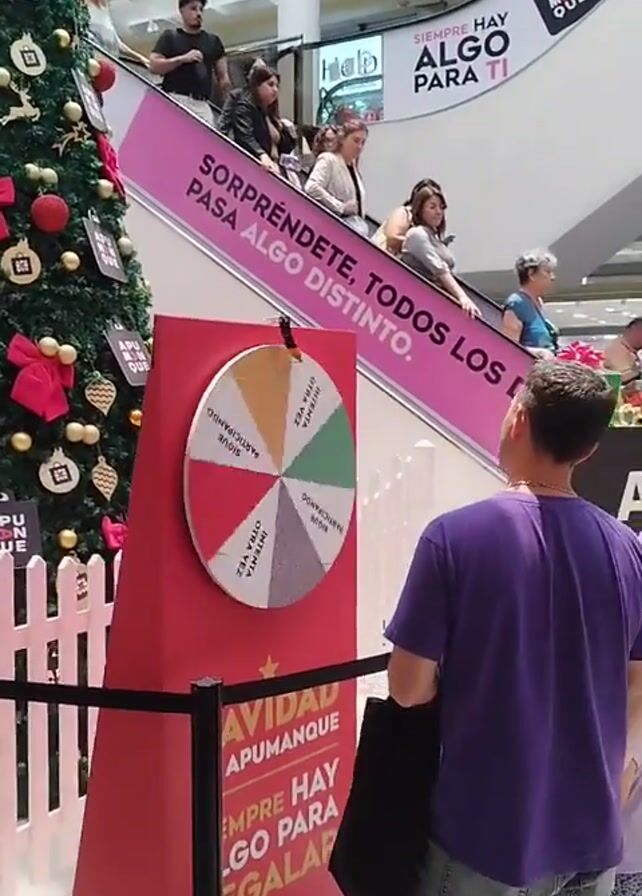 The video depicts a scene inside a shopping mall decorated for Christmas. A large Christmas tree adorned with red bows, ornaments, and tags stands next to a red stand featuring a prize wheel. The wheel is divided into different colored segments with Spanish text on each. A man in a purple shirt stands near the wheel, appearing to watch it spin. In the background, an escalator carries people up and down. On the escalator, several individuals are visible including men, women, and children. Signage is visible above the escalator with text written in Spanish. Another sign decorated with gift boxes is partially visible behind the man. A small child is also present in the foreground, standing next to a woman. The overall environment suggests a festive and commercial atmosphere.