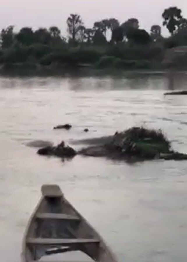 partially flooded wooden canoe on the bank of a wide, slightly turbulent river at dusk or dawn. The opposite bank has trees and some bushes along the shoreline. The sky is a light color, possibly due to the time of day. The boat is the focal point of the video, and it is partially filled with water. The river's surface is rippled and reflects the sky. There are some small islands or rocky patches in the middle of the river.
