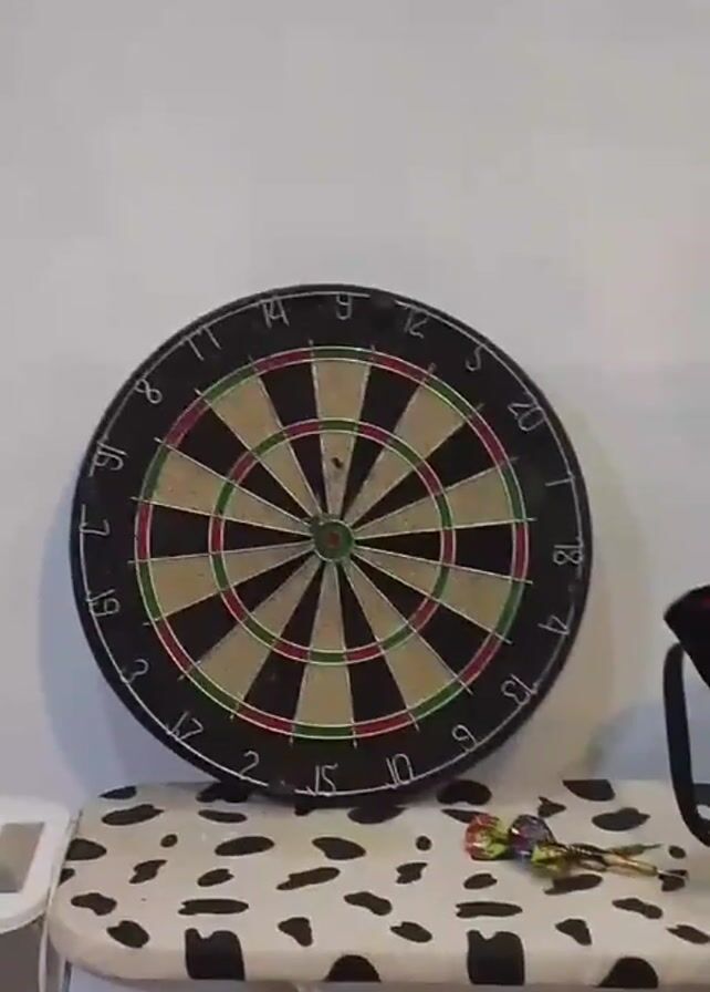 A dart is thrown and hits the bullseye of a dartboard. The dartboard is mounted on a white wall. A folding table with a cow-print pattern is beneath the dartboard. Two darts are lying on the table near a black bag.