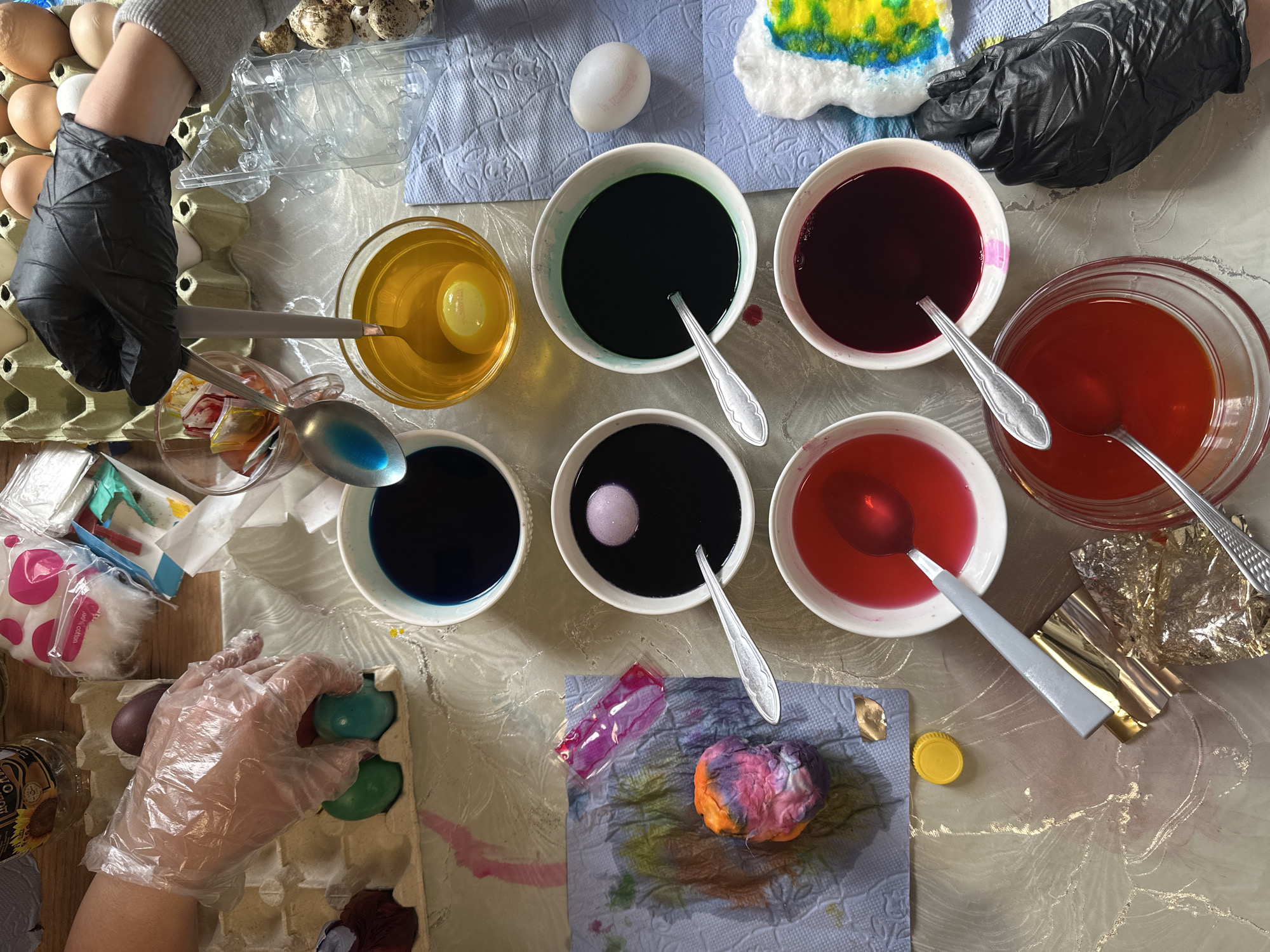 A high-angle view depicts a scene involving the dyeing of eggs, likely for Easter. The setting is a table, possibly in Cherven Bryag, Bulgaria, as requested, although the location is unverifiable from the image alone. The scene is dominated by bowls containing colored liquids, presumably egg dyes, in shades of yellow, green, red, and various shades of blue and purple. Spoons are present in each of the bowls. To the left of the image are several cardboard egg cartons. One contains brown eggs, while another contains dyed eggs in green, blue, and purple. Another carton is filled with quail eggs. Two hands are visible. One hand, wearing a black glove, is lowering a white egg into a bowl of yellow dye. The other hand, wearing a transparent plastic glove, is retrieving previously dyed eggs from a carton. Additional items are scattered on the table: a plastic egg holder, cotton balls, a roll of aluminum foil, a yellow bottle cap, and a paper towel with dye stains. An already dyed egg is also sitting on a paper towel.