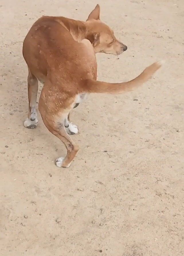 - ". A top-down, still shot captures a medium-sized, brown dog lying on its back on a tan, textured surface, possibly concrete or compacted dirt. The dog’s legs are splayed out with white markings on the paws. Its tail is raised, almost perpendicular to its body, and its head is turned upwards as it scratches its underbelly with one of its hind legs." by FM-7Xucg1, licensed under CC BY 4.0
