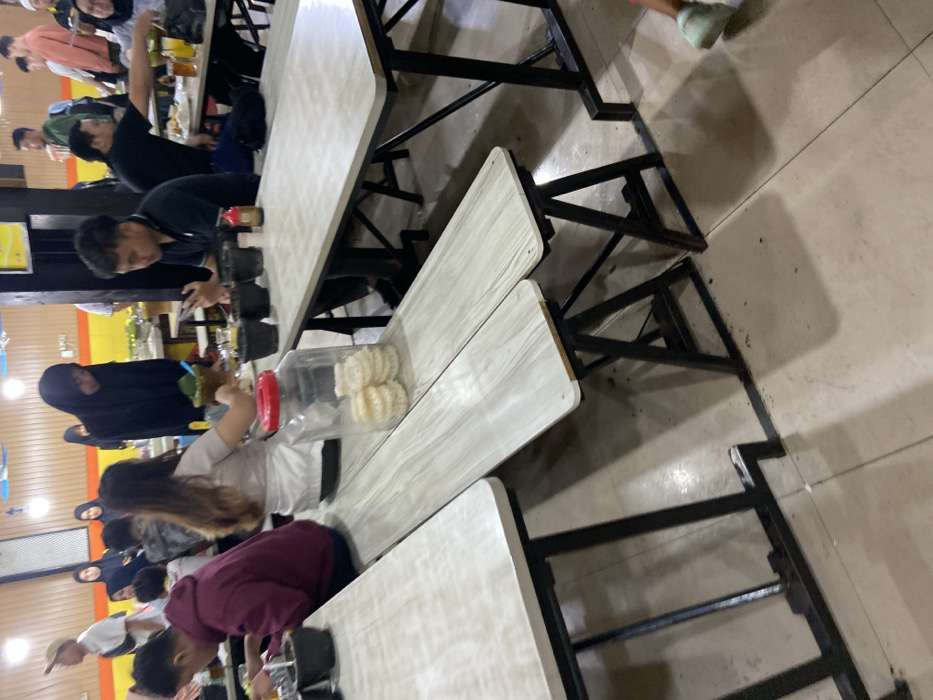 dining area with several tables and chairs, most of which are empty. One table has two people sitting at it: a woman wearing a white shirt and a man wearing a black shirt. Another woman, wearing a black hijab, is standing at the table next to them. The table is covered in a white tablecloth, and there is a glass jar filled with white crackers and a red lid on the table. The area appears to be in a restaurant or a cafe. The image was taken in Bandung, Indonesia. The coordinates -6.891, 107.632 are for Bandung. The floor is tiled and there are a few pieces of debris on the floor.