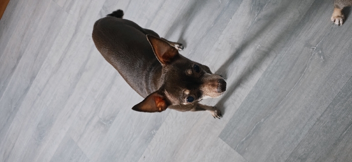 - "A small, dark brown short-haired dog, resembling a Chihuahua, stands centrally in an indoor setting on a light grey laminate floor in Saint Petersburg, Russia" by FM-Uibel2, licensed under CC BY 4.0