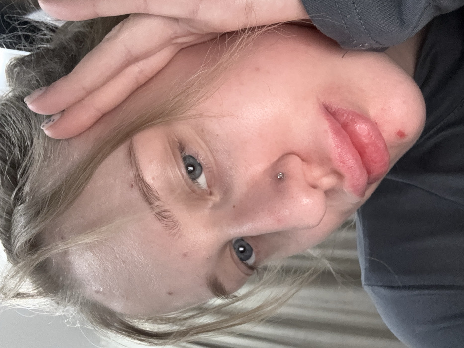 The image presents a close-up, head-and-shoulders portrait of a single individual, a female of apparent young adult age, looking directly at the camera. Her light-colored hair, appearing blonde or light brown, is loosely styled. Her eyes are blue. A small, metallic stud is visible in her left nostril, indicating a piercing. Her lips are full. A small, reddish mark or blemish is present on her chin, below the center of her lower lip. The subject's right hand is partially visible along the right side of her face, fingers lightly pressing against her temple and cheek, suggesting she is holding a device to capture the image. She is wearing a dark grey, long-sleeved garment. The background is out of focus, indicating an indoor setting with diffuse lighting; faint vertical lines on the left may correspond to window coverings or wall textures. The specific location within Novoalexandrovka, Russia, cannot be determined from the visual information provided.