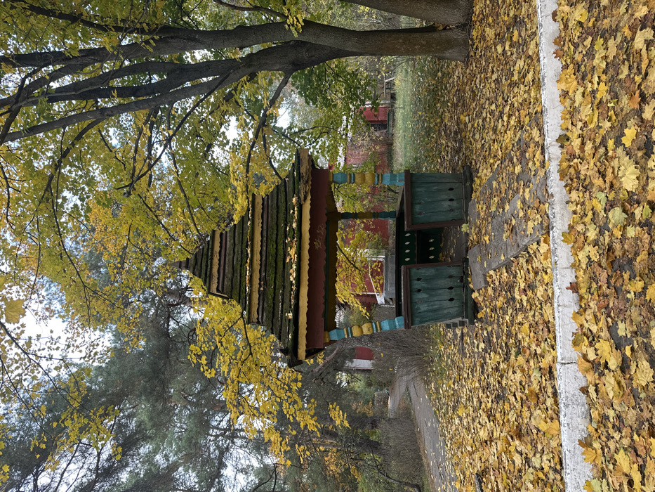 An outdoor scene in Irpin, Ukraine, depicts a weathered wooden gazebo in autumn