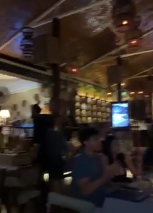 interior of a restaurant with a thatched roof and decorative hanging lanterns. People are seated at tables, and there’s a bar area with lit screens. The camera then moves towards a window, revealing a view of a beach at night, with dark ocean water meeting a sandy shore. Waves are visible, and two people are seen on the beach. Finally, a person's legs appear in the frame, their feet resting on the window sill.