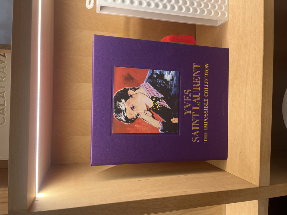 A purple hardcover book, "Yves Saint Laurent The Impossible Collection," sits angled on a light wooden shelf
