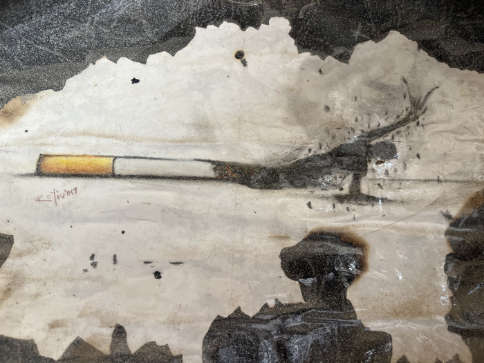 This image displays a fire-damaged artwork on paper, located in Jos, Nigeria