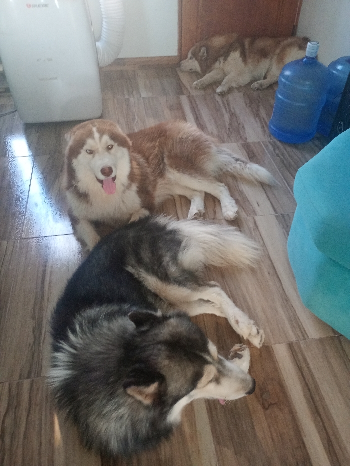The image depicts an indoor scene in Pozo Almonte, Chile, featuring three large dogs resting on a wood-grain tiled floor