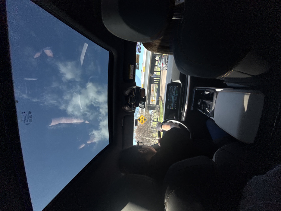Inside a car, a driver in a black shirt holds the steering wheel, looking toward a roadside sign. The car travels under a bridge. Sunlight streams in through the sunroof, reflecting clouds. The vehicle's interior features black seats and a light gray center console. A navigation display is visible. Another passenger is present in the backseat.