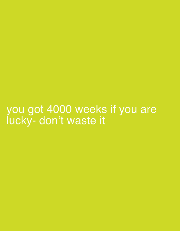 The image features a solid chartreuse green background. In the bottom center, white text reads, "you got 4000 weeks if you are lucky- don't waste it." The font is sans-serif and appears relatively simple. The text serves as a motivational or cautionary message about the finite nature of life and encourages the viewer to make the most of their time.