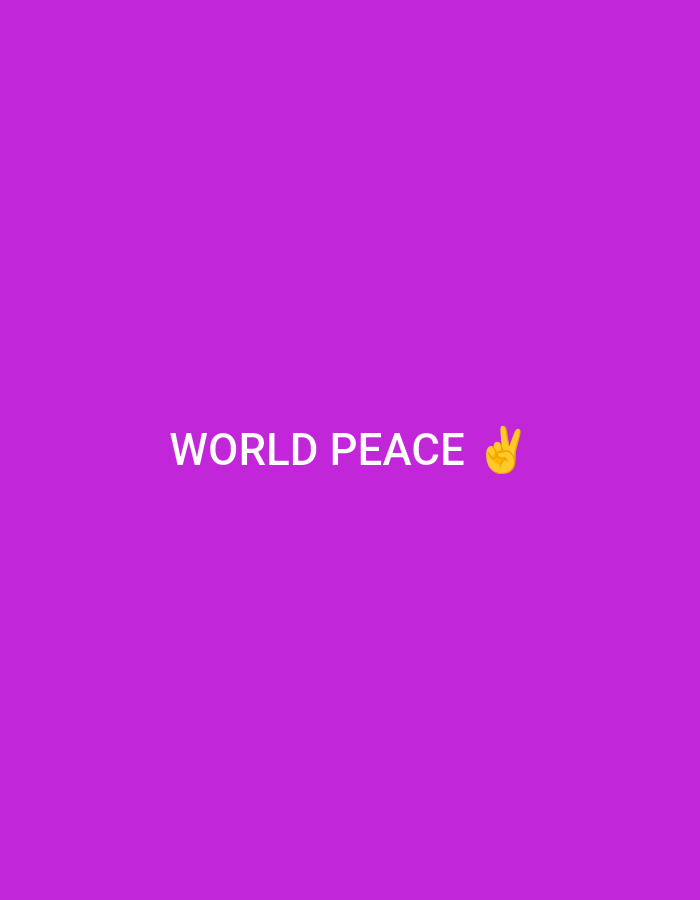 The image displays a digital graphic with a solid purple background. Centered horizontally, approximately in the middle of the frame, the words "WORLD PEACE" are rendered in white, sans-serif capital letters. To the immediate right of the text, a yellow hand emoji forms a "V" sign, signifying peace. No physical location in the city of Rumuekini, Nigeria, is depicted. The scene contains no individuals, physical objects, actions, or interactions, consisting solely of text and an emoji on a monochromatic digital canvas.