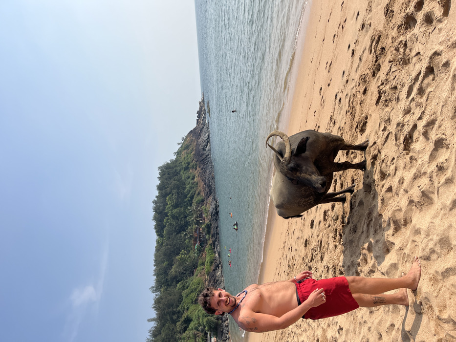 This image captures a beach scene in Gokarna, India, under clear, bright daylight. In the left foreground, a shirtless male, appearing to be in his 20s or 30s, stands barefoot on light brown sand. He wears red swim shorts, a blue beaded necklace, and has visible tattoos on his left shoulder/arm and lower leg. He is smiling and looking directly at the camera. To his immediate right, a dark grey water buffalo stands on the sand, its head turned slightly towards the left, displaying prominent, backward-curving horns. The background reveals the turquoise-blue ocean with gentle waves, where several individuals are visible swimming or floating on inflatables at a distance. The left side of the background shows a rocky headland covered with dense green trees and vegetation, with some small structures visible within the foliage. The sky above is clear and light blue.