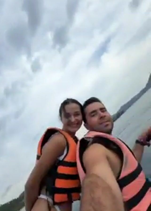 The video starts with a view of a coastline and the sea from a moving boat on a cloudy day. The camera then turns to show a man and a woman on the boat, both wearing orange life vests. They are smiling at the camera. The camera returns to a view of the sea and cloudy sky.