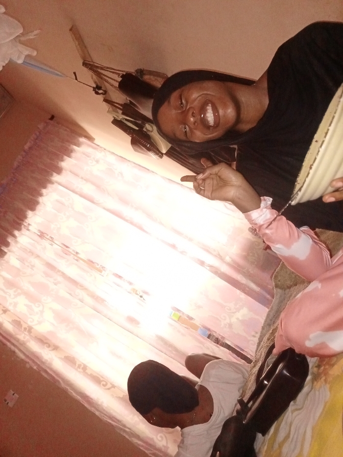 The image depicts an indoor domestic setting, purpose unknown. The scene is presented from a tilted perspective. In the upper portion, a dark-skinned female individual is visible from the chest up, wearing a black head covering and a black top. She exhibits a broad smile, exposing her teeth. Her right hand, adorned with a ring on the fourth finger, is raised and curled as if gesturing. She holds a light-colored bowl with her left hand, partially obscured. Behind her, a pale pink wall is visible, with multiple dark-colored bags or accessories hanging on a wooden fixture. In the lower portion of the frame, a second individual is partially visible, seated or lying on a light-colored surface, possibly a bed or sofa. This individual wears a white t-shirt and light pink and white tie-dye patterned long-sleeved top and pants. Their head is turned downwards and away from the camera. A dark-colored object, possibly a bag or case, rests beside them. Prominent patterned light pink curtains, through which bright natural light is entering, occupy the left and central mid-sections of the image. The wall behind the curtains is light pink.