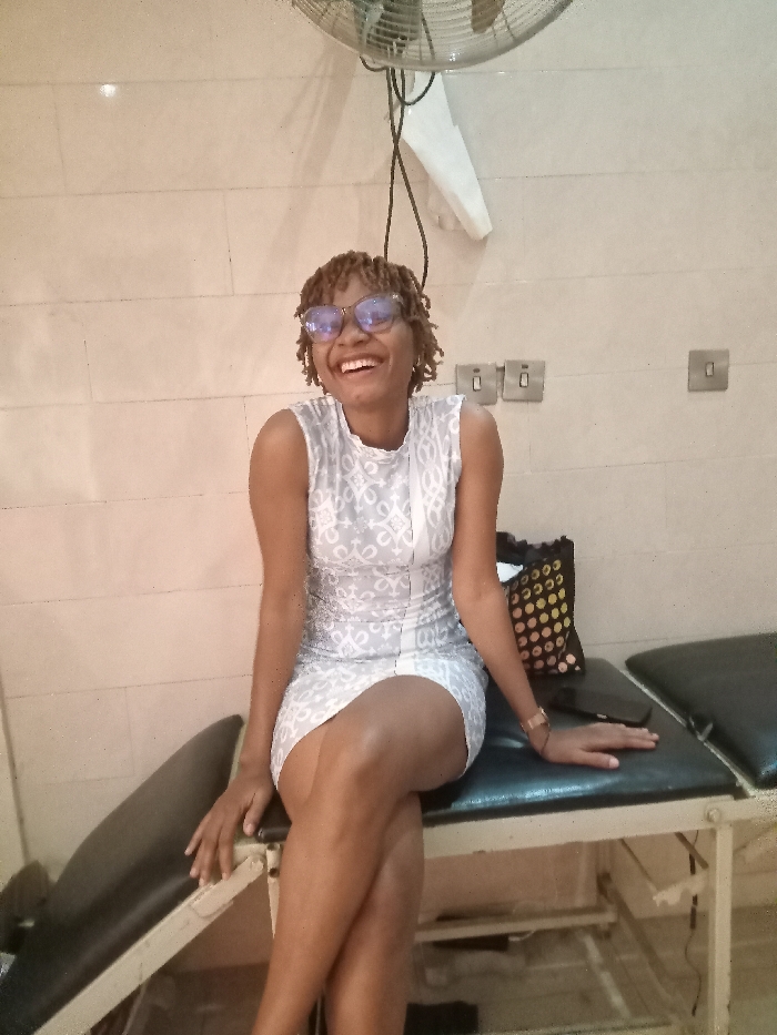 A woman sits on an examination table, her legs crossed. She wears a patterned white dress and glasses. Her hair is styled in short, light brown twists. She smiles broadly. A fan is above her head, and a bag and a phone sit next to her on the table. The wall is tiled with rectangular tiles. Two light switches and one outlet are on the wall behind her.