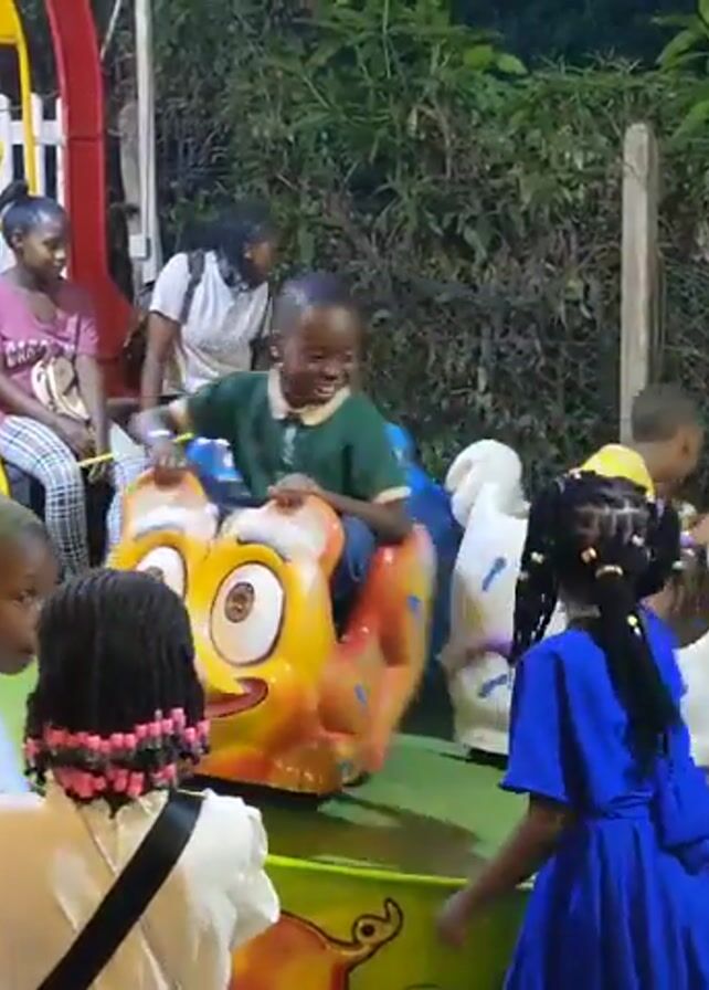 group of children enjoying a carousel ride at an outdoor amusement park