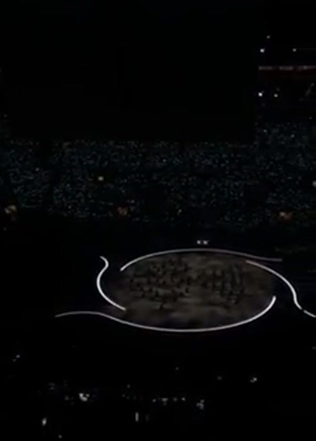 performance at a large indoor venue, likely a stadium or arena. The stage is round and decorated with white lines, and a group of performers dressed in dark clothing are present on the stage. The audience is very large, filling the seating area, and they are holding lights, making the venue glow with numerous small points of light. There is some fog or haze in the air, and the overall lighting is dark except for the stage and audience lights. The camera angle is high, looking down on the stage and audience.